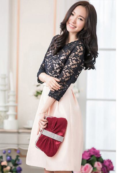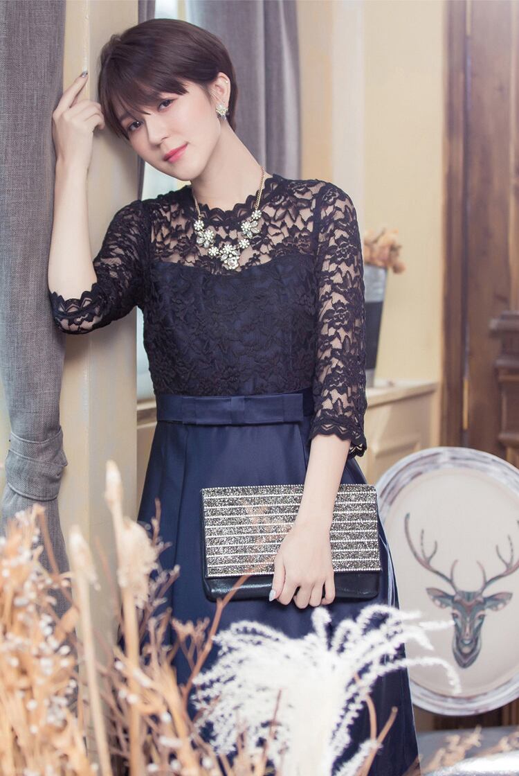 七分袖でやウエストのリボンでキッチリ感を出しながらも、ブラックのレースや背中のホックでセクシーを演出!