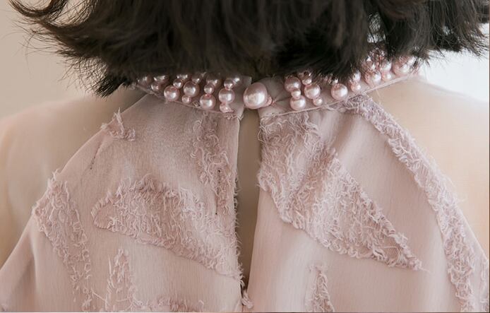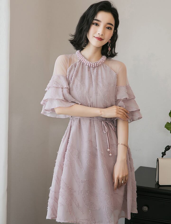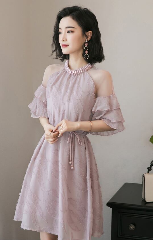 ホルターネック風の首元や、何層にも重なった袖のフリルで華奢見え抜群のワンピース。