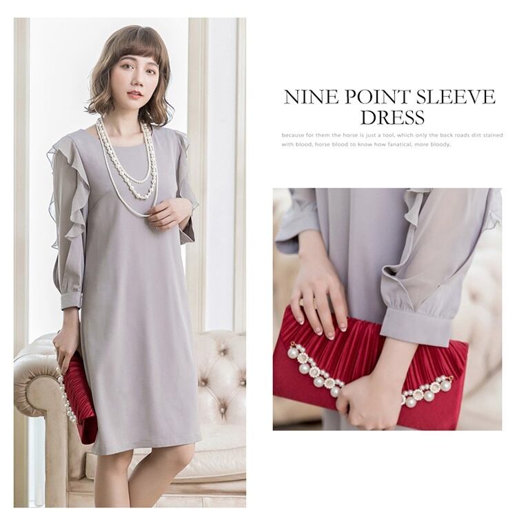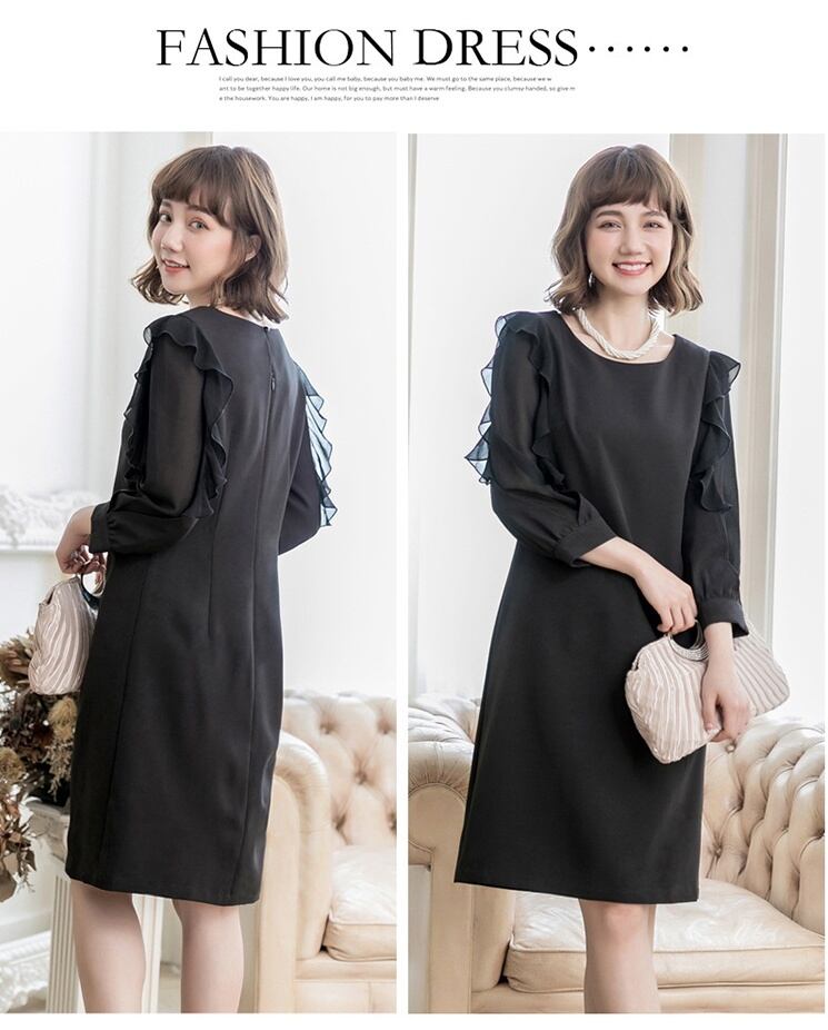 袖のフリルが大人かわいい、洗練されたデザインのサック型ワンピースです。