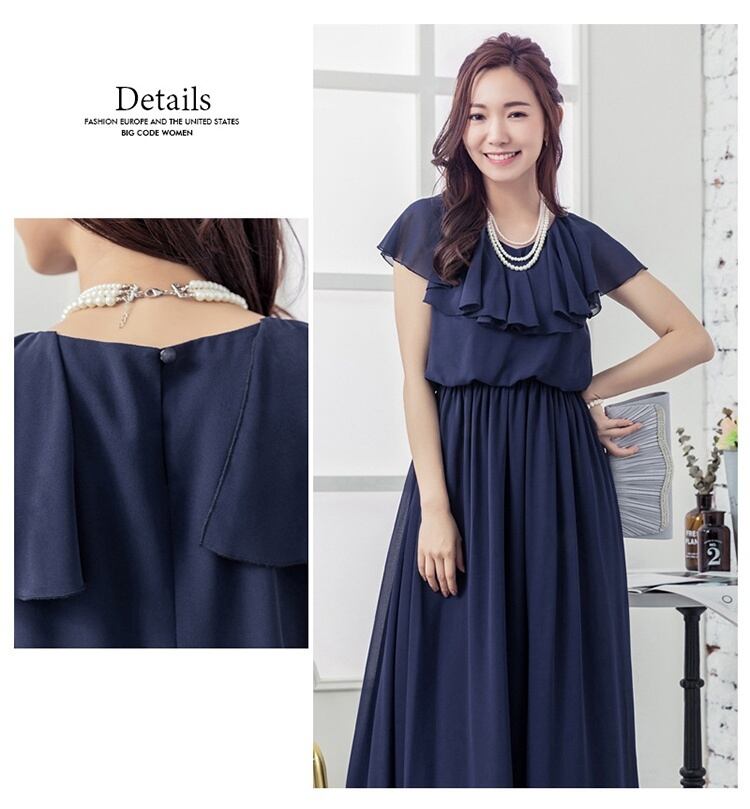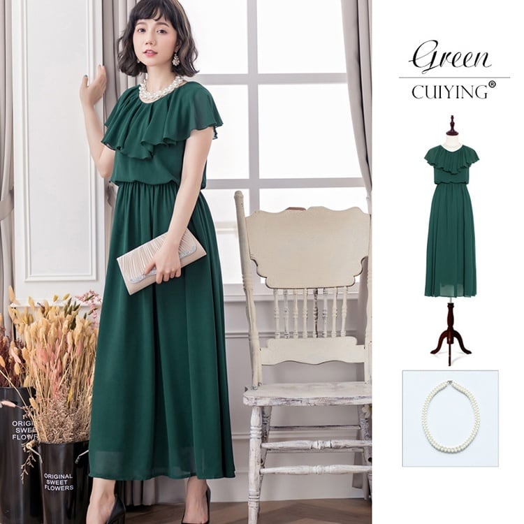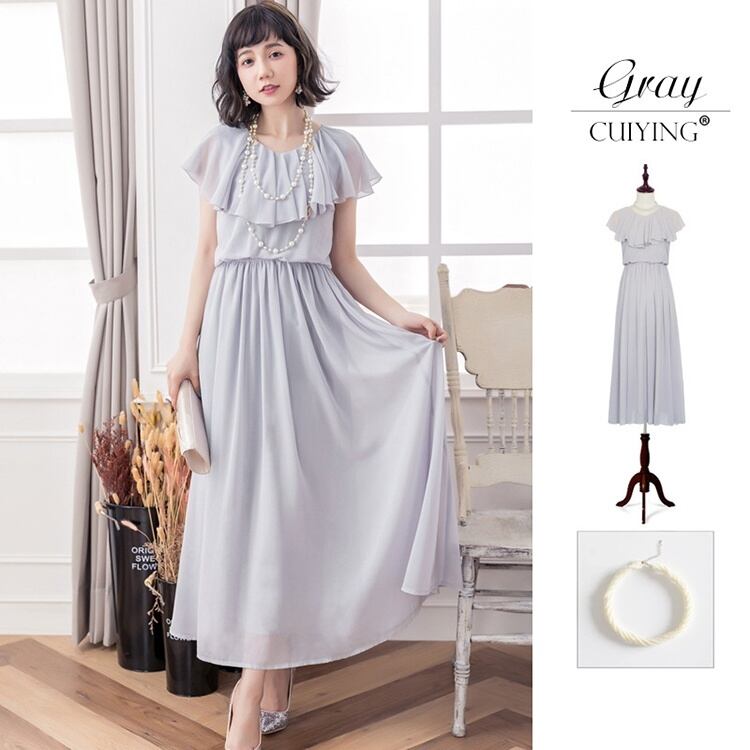 胸元のボリュームあるフリルがキュートなロングドレスです。