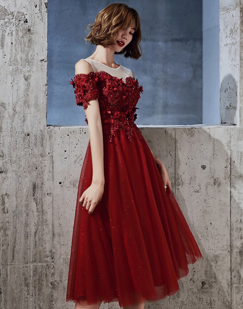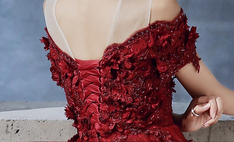 同色のフラワーモチーフを上半身に敷き詰めたゴージャスなデザインのドレス。