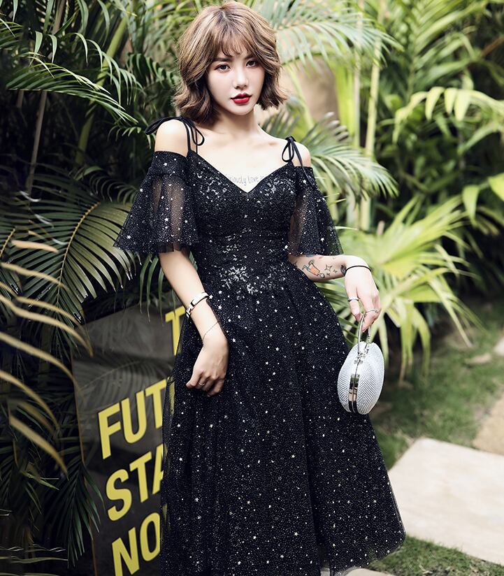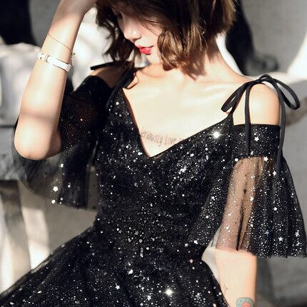 大胆にあいた胸元、オープンショルダー、全体のラメがセクシーなドレス。