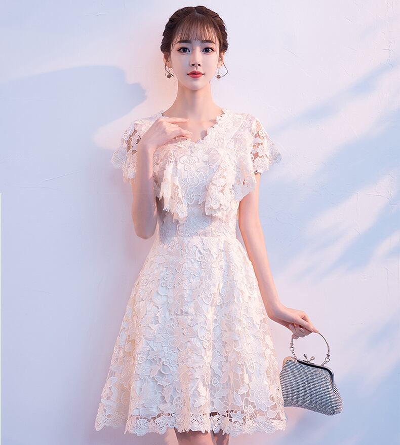 シャンパンカラーの総花柄レースが清楚で可憐なワンピース。