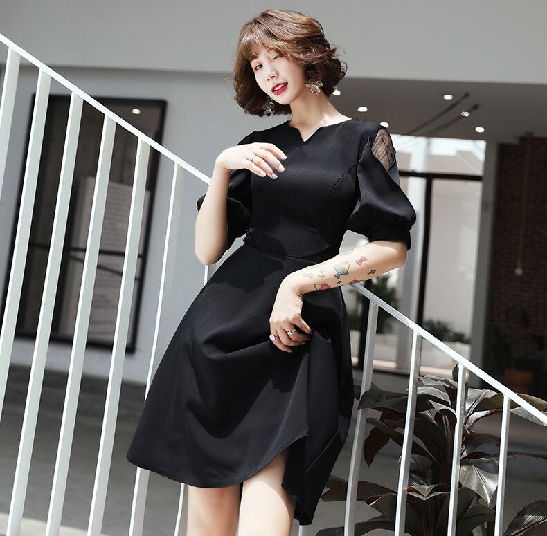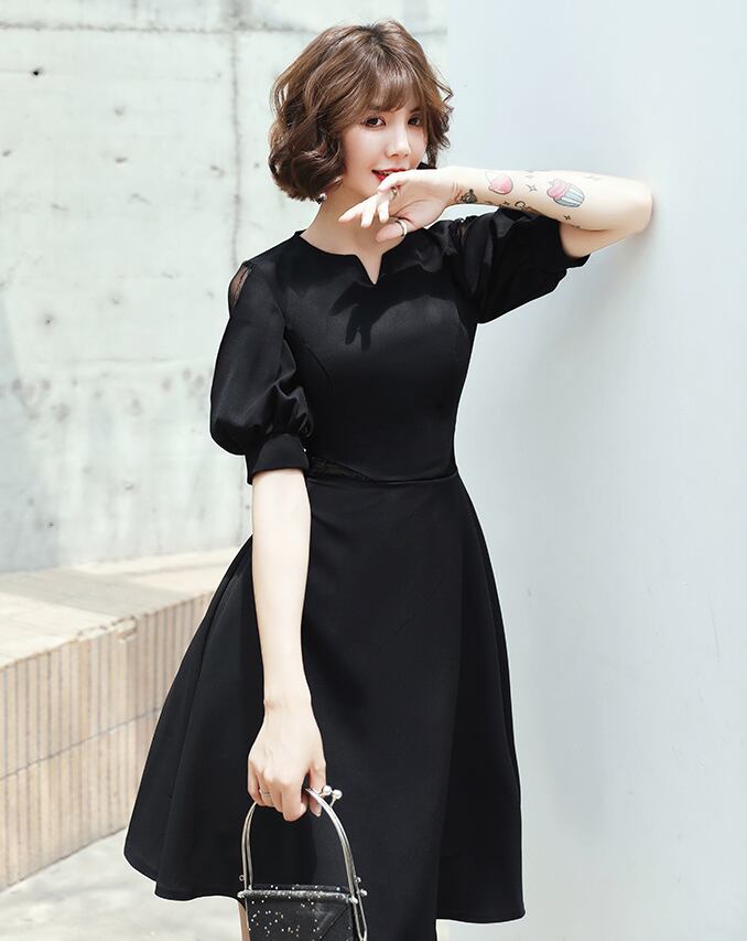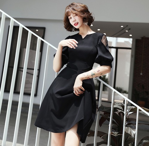 バルーンスリーブでかわいらしくもあり、また、スリットネック、胸元がぴったりしたデザインでセクシーな印象のドレス。