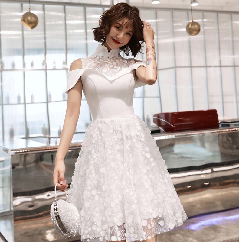 オープンショルダー、ふわっと広がるスカート、キュっとしまったウエストでスタイルの良さを強調してくれるミディアム丈の真っ白なドレス。