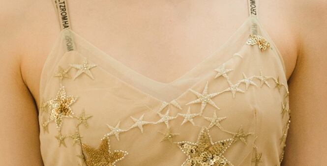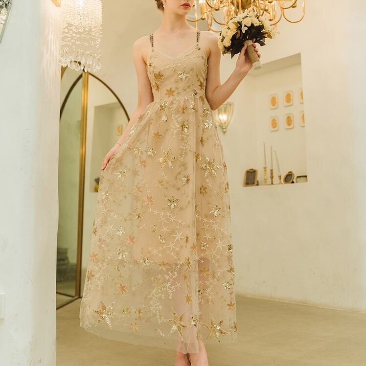 無数のスパンコールで作られた星がゴールドのレースに散りばめれ、とてもロマンチック☆