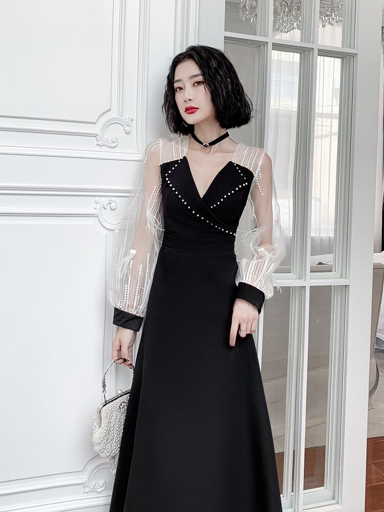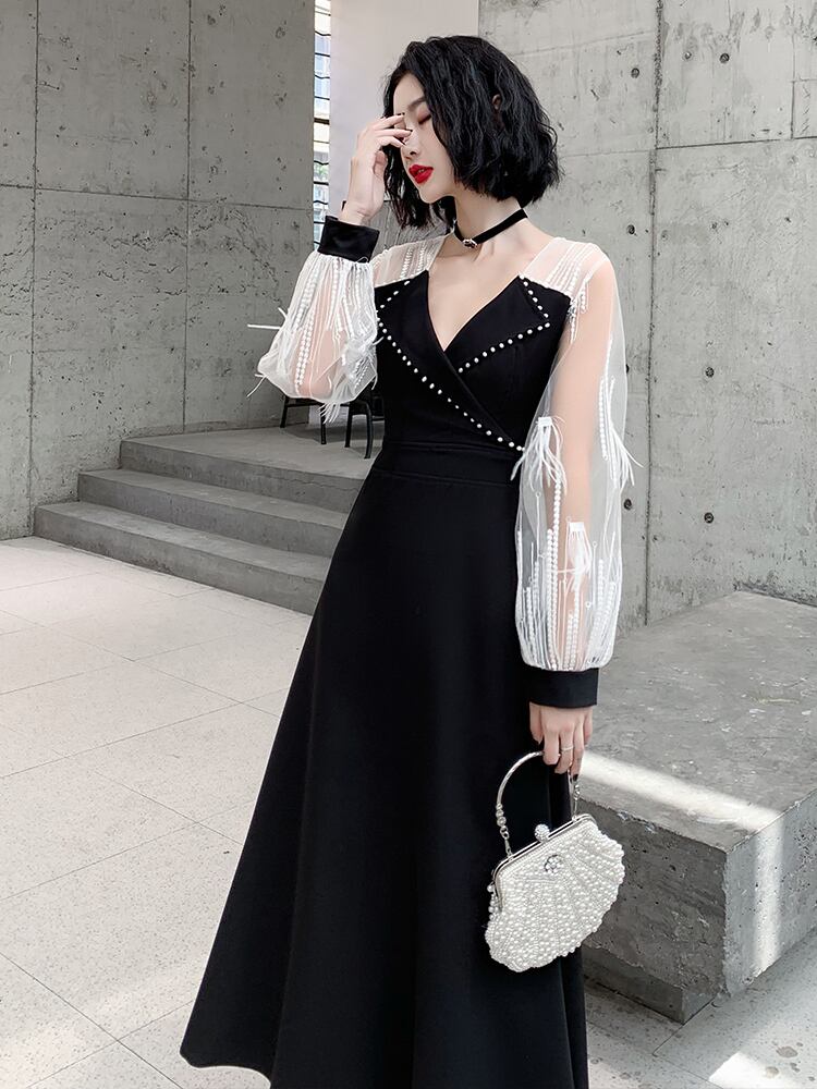 ジャケット風の胸元がセクシーでクールなバイカラーのロングドレス。