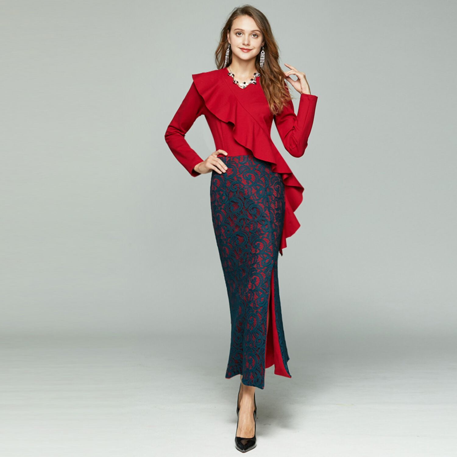 肩から落ちるフリルやスリットの入ったマーメイドラインが美しいワンピース。
