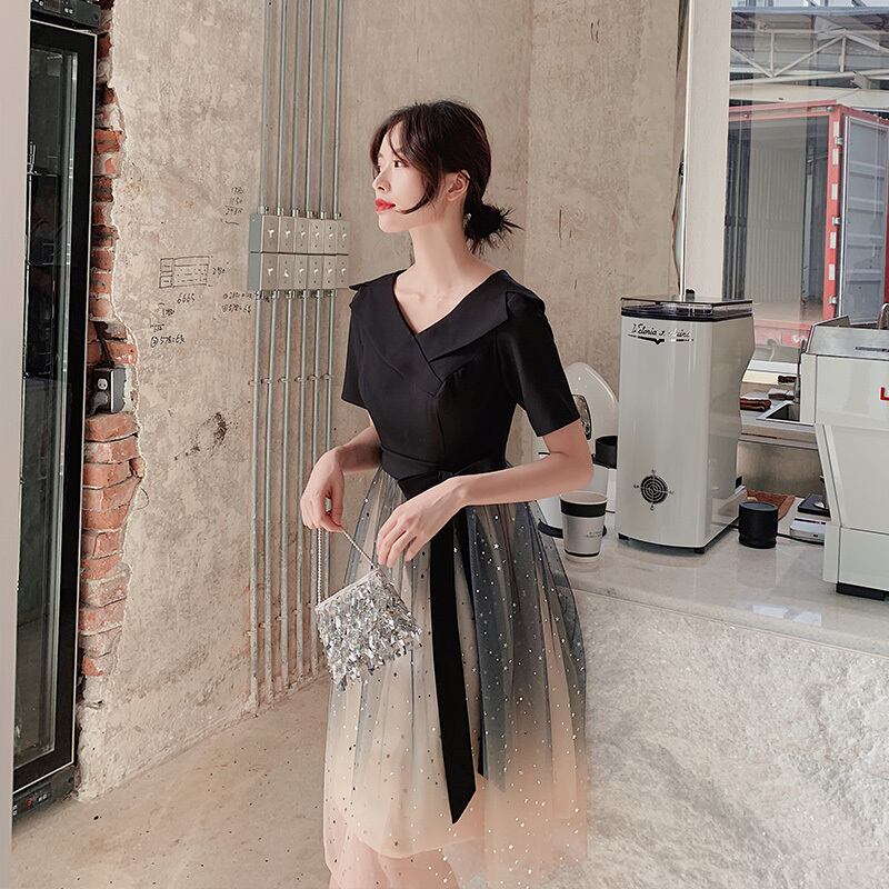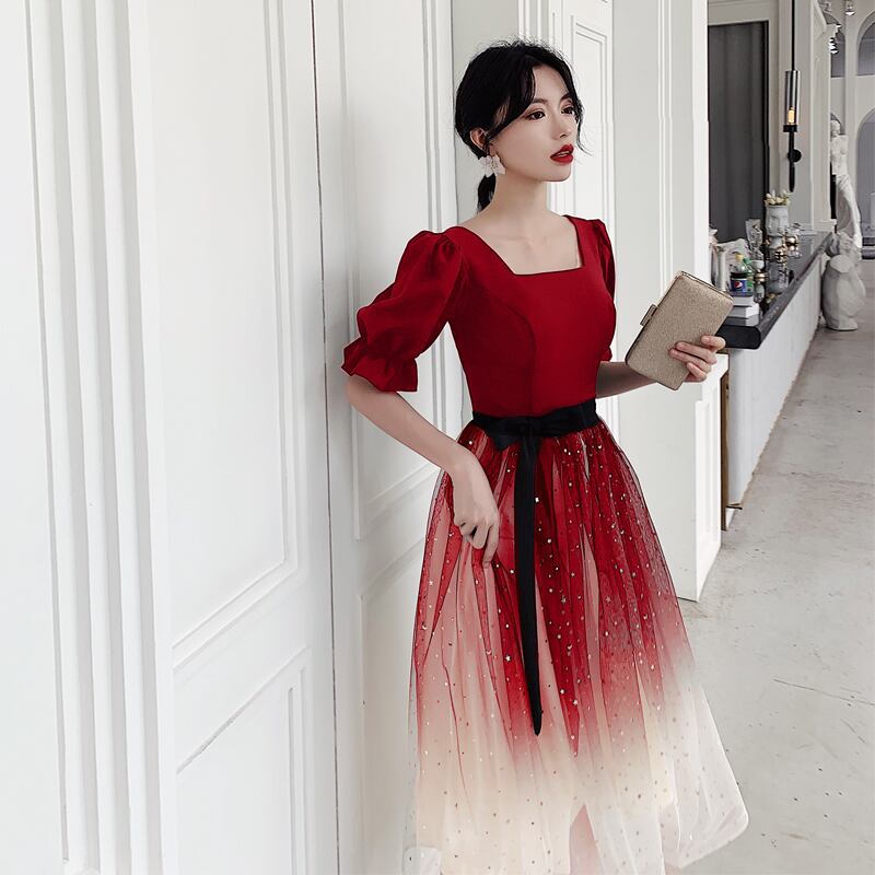 グラデーションがきれいなミモレ丈のシフォンドレス。