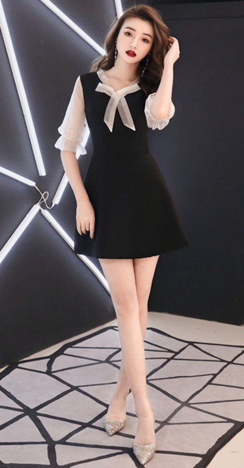 胸元のリボンと透け感のあるバルーンスリーブがキュートなワンピース。