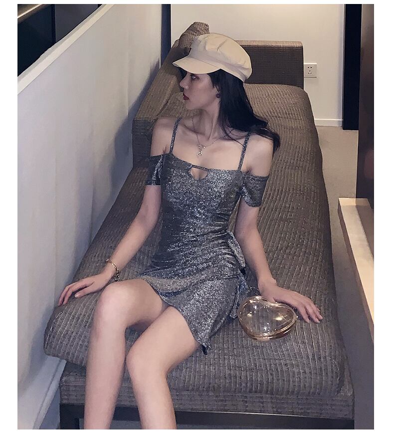光沢のあるサテン生地の、大人っぽいタイトワンピースです。