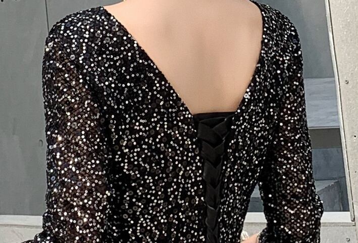 まるで満点の星空を見ているよう。ブラックの生地に散りばめられた無数のスパンコールが美しいロングドレスです。