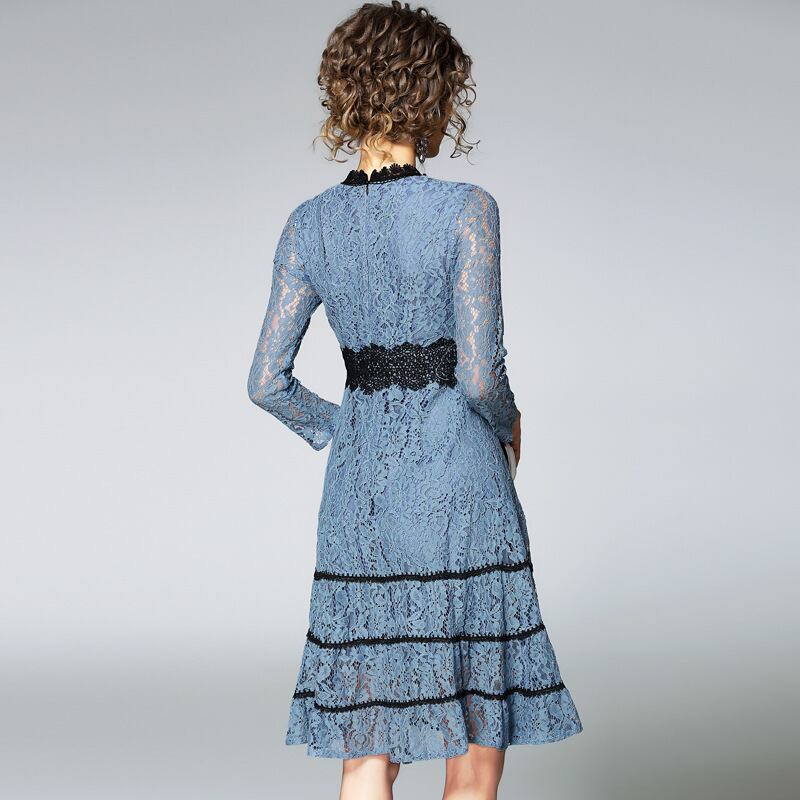 落ち着いたブルーの総レースが非常にエレガントなひざ丈ワンピースです。