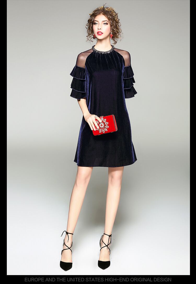 深いブルー&高級感のあるベルベットのサックドレスです。