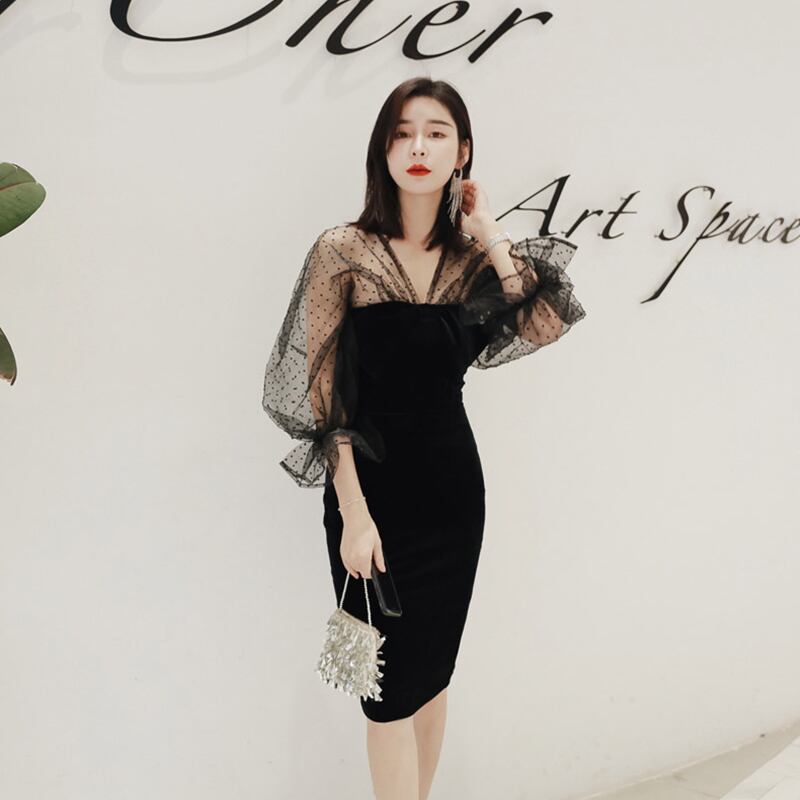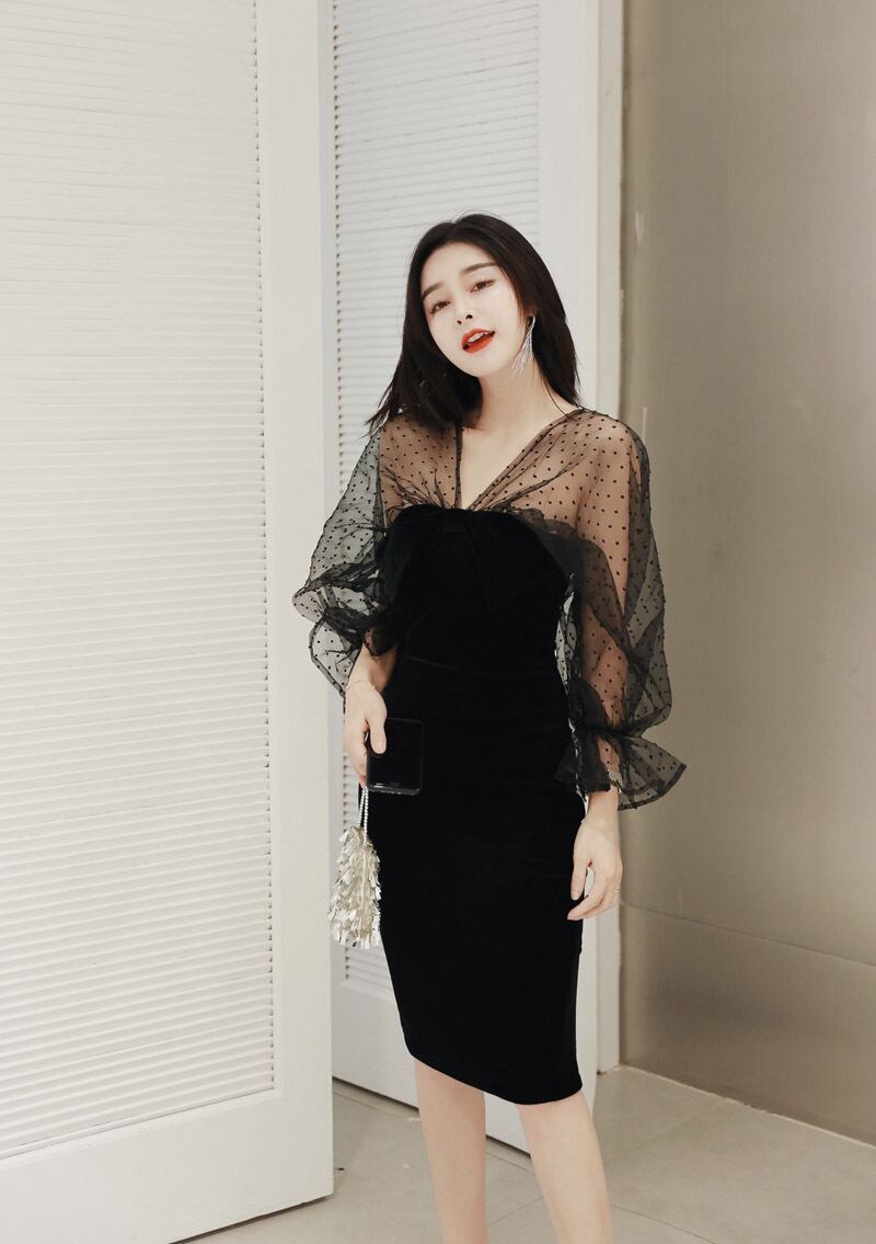 チュール袖付きのシンプルなベアトップワンピース。