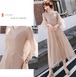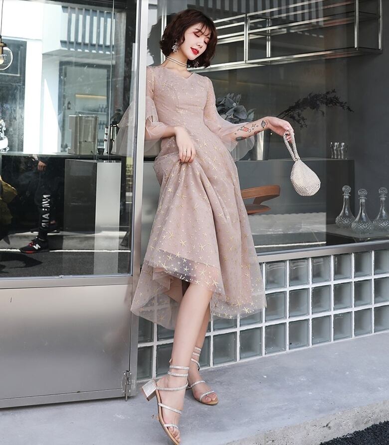 ふんわり甘い雰囲気漂う、淡いベージュのミモレ丈ワンピースです。