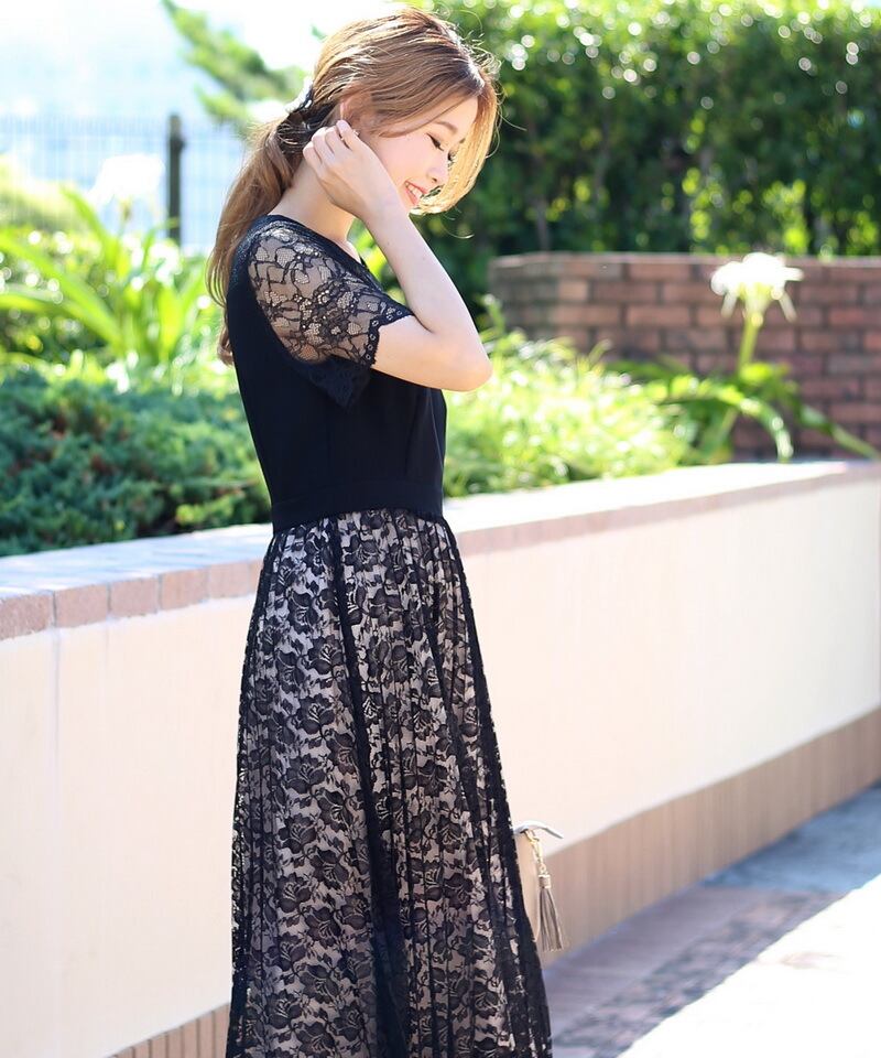 フラワーのレースがリッチで繊細なミモレ丈のワンピースです。