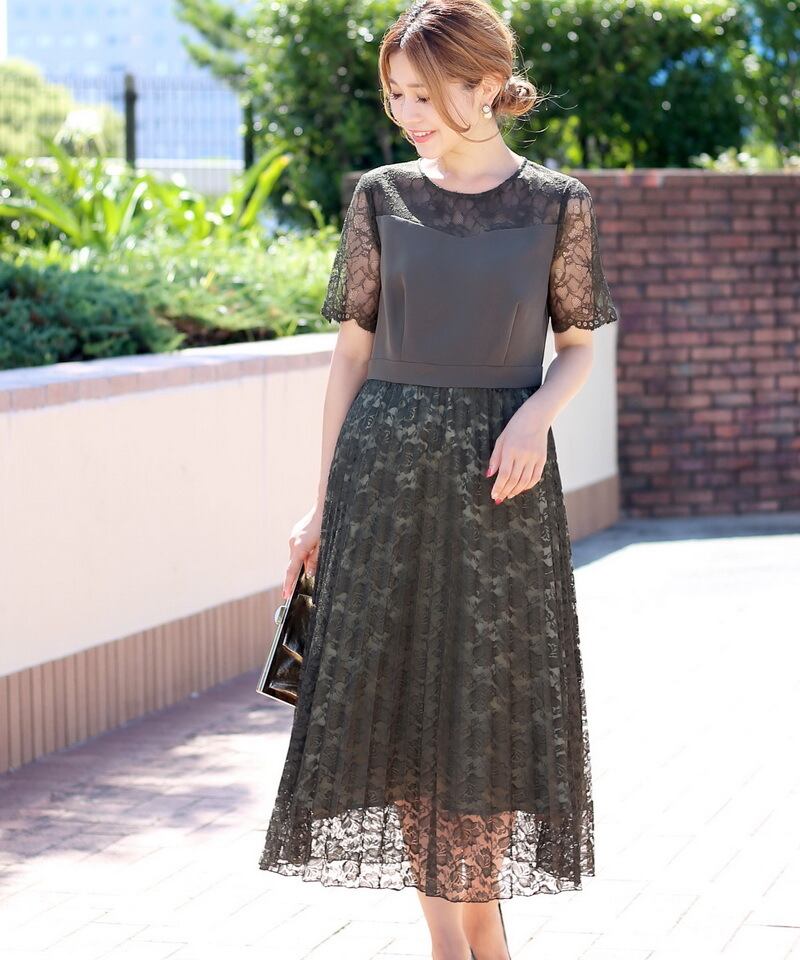 内側の生地が透けて見えるレースのプリーツスカートがシックな装い。