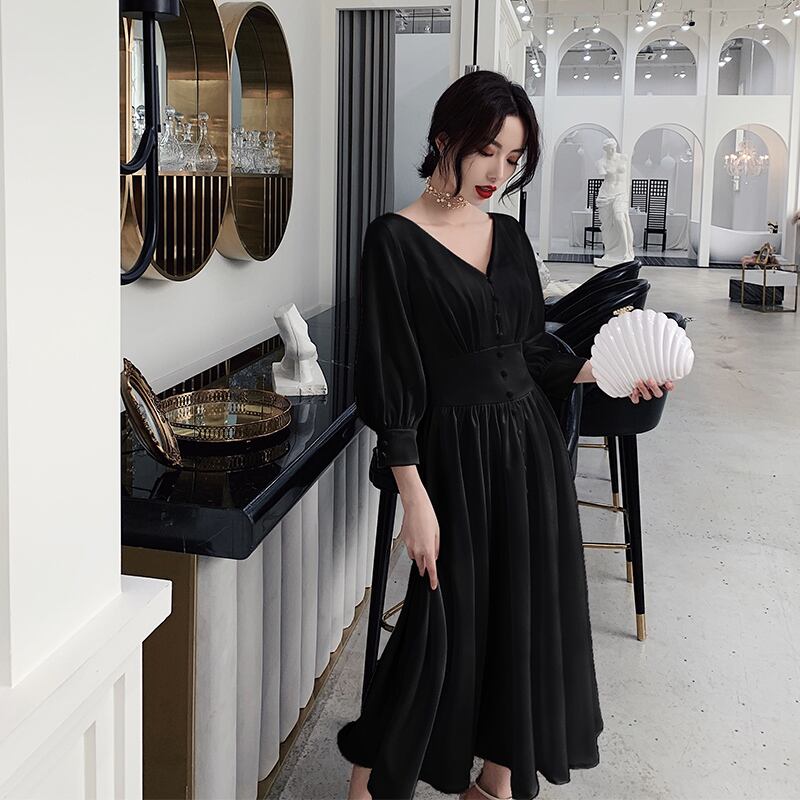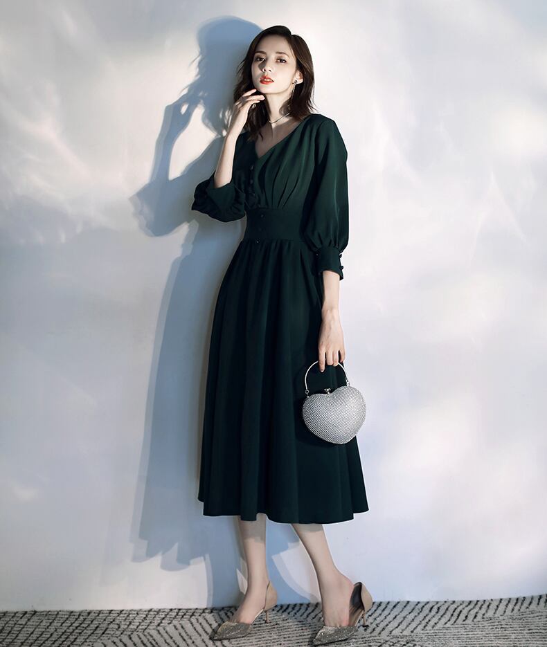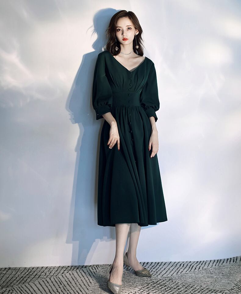 フロントに一列に並ぶくるみボタンがかわいらしいミモレ丈のワンピース。