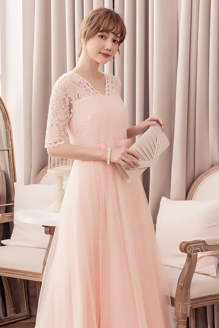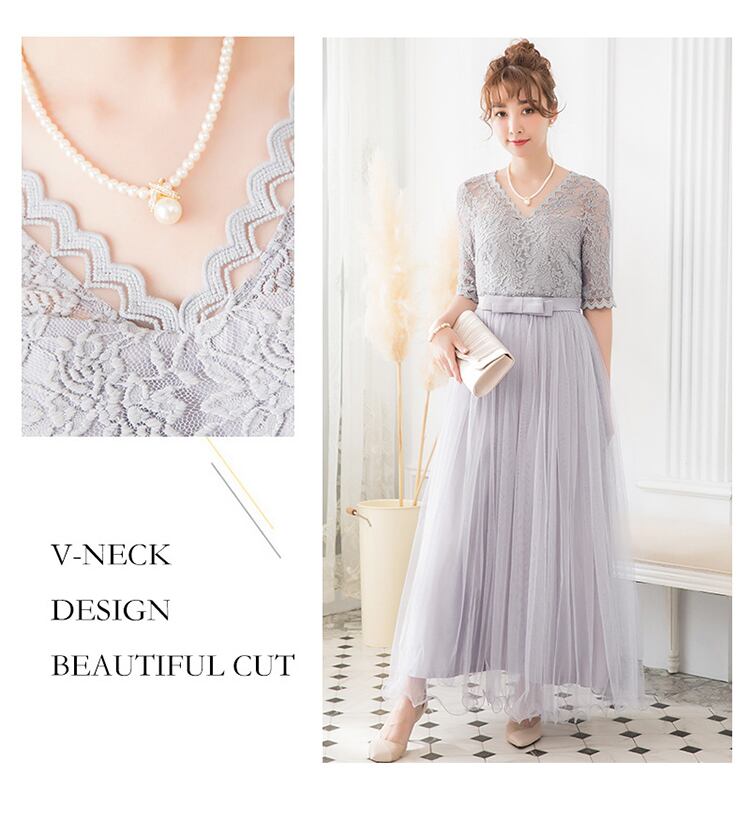 レースとチュールがエレガントな印象のマキシ丈ドレスです。