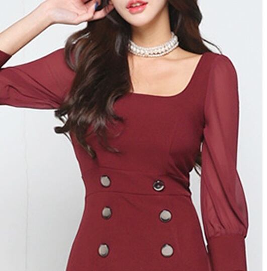 ワインレッドの落ち着いた色味やスクエアネックが大人っぽく、結婚式や二次会、お呼ばれなどに活躍できること間違いなしです。