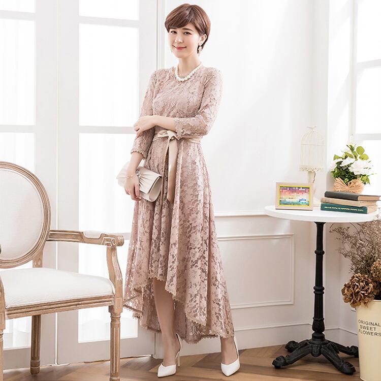 花柄レースがゆらゆら揺れる、フィッシュテールのミモレ丈ドレスです。