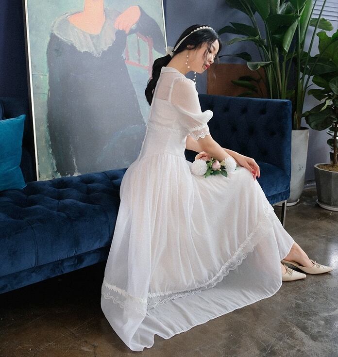 ビクトリア朝の古典的なシルエットが、清楚で美しいオフホワイトのワンピースドレスです。