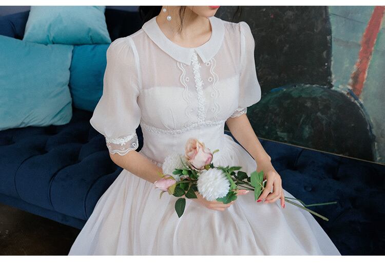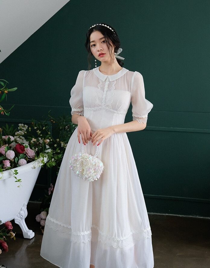 丸みを帯びた襟や胸元の繊細なデザインが、大人になる手前の純真無垢な少女を思わせます。