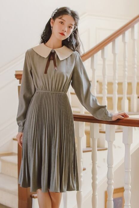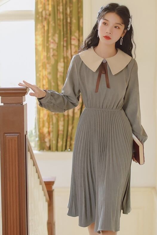 大きな襟やネックリボンが、西欧風の女学生を思わせる、レトロなワンピースです。