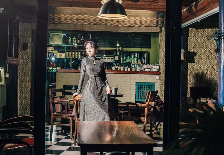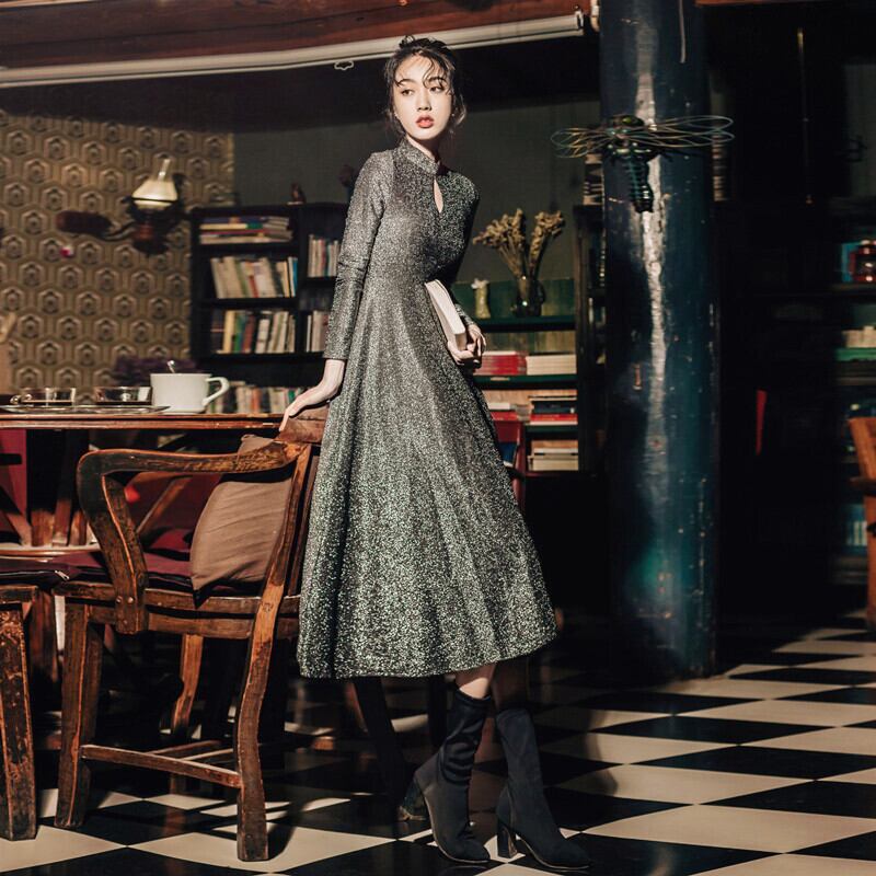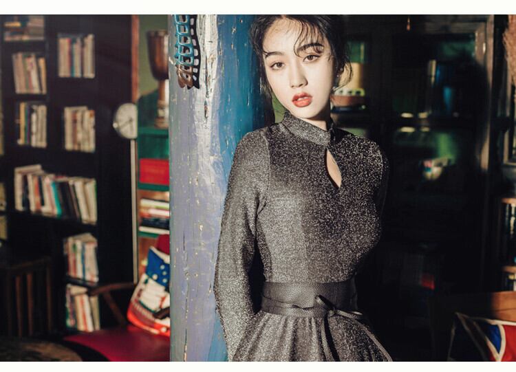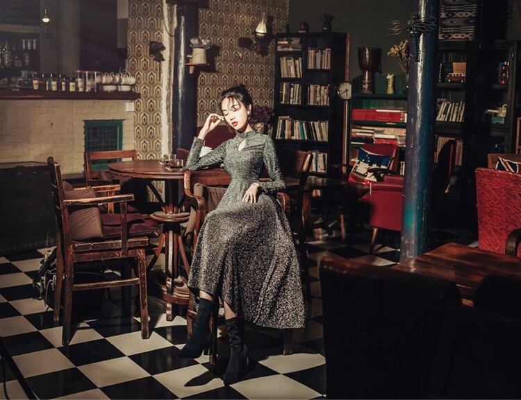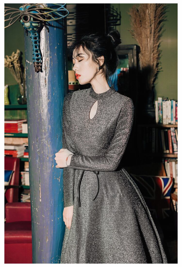凛としたボトルネックに、ティアドロップ型に開いた胸元がオシャレなワンピースドレスです。